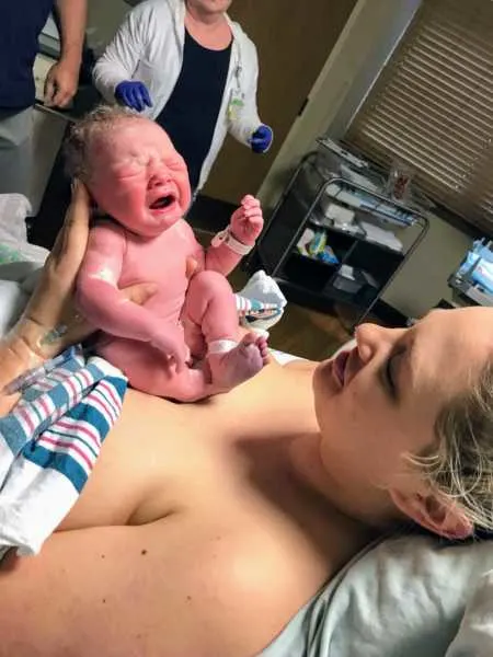 Millie was actually delivered by a different doctor, not my usual one, so she didn’t know about the FaceTime at first. But my doctor told her to take the phone out and let Brooks see what was going on. He kept telling me I was doing great and said, “It’s okay, you’re doing amazing.” I could hear him wincing and saying “Wow!” with each push. I also heard people in the airport cheering.