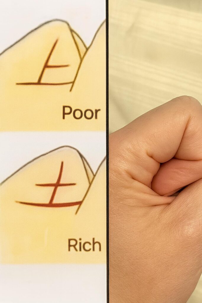 The bottom half shows a different configuration of crossed lines, labeled “Rich.” The deeper and more distinct cross on this palm indicates that this pattern is linked to financial success or wealth in this interpretation.