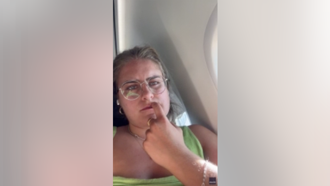 A flight passenger captured on video when her neighbor leaned into her space on a recent flight. The footage has gone viral on TikTok. (Fanny Gagnon O’Donnell/Storyful)