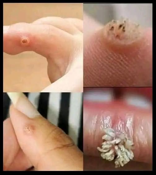The image shows different types of warts, which are small, rough skin growths caused by the Human Papillomavirus (HPV).