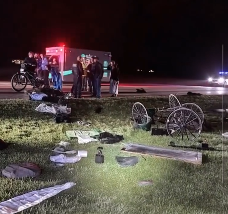 A late-night crash turned tragic when a Jeep struck a horse-drawn Amish buggy on State Road 218 near Berne, Indiana. The quiet rural scene quickly became chaotic as first responders arrived to find the buggy shattered across the roadway and the Jeep in a nearby ditch. The buggy was carrying nine people at the time of the crash.