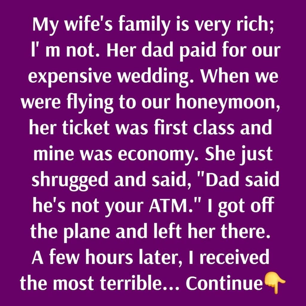 Darren had an economy ticket, while his wife flew first class. She casually said, “This sucks, but Dad says he’s not your money machine.” Her words, meant lightly, made Darren feel embarrassed and angry. He decided to leave the plane entirely. A few hours later, he received a call from his father-in-law. “I gave you a dream wedding and honeymoon without asking you to pay anything. Is this how you treat my daughter?” he said. “My daughter is used to a certain lifestyle, and I will continue providing for her, but I won’t support you.”